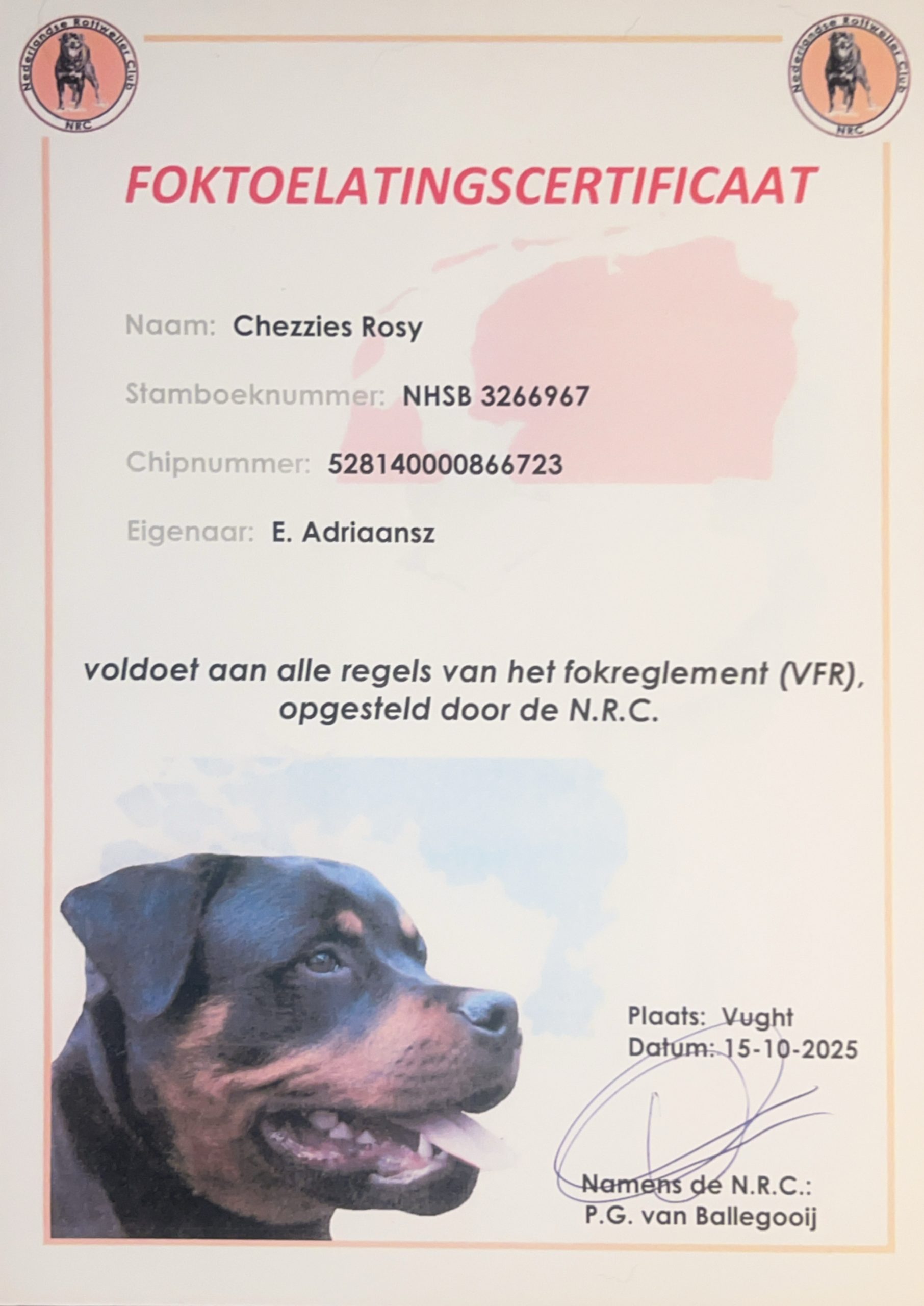 Rosy voldoet al lange tijd aan alle fokvoorwaarden van de Nederlandse Rottweiler Club. Ze heeft haar kwaliteiten als moeder al bewezen met haar prachtige T-nestje. Inmiddels hebben we met wat vertraging ook haar officiële Fokkaart ontvangen — het bewijs dat alles is gecontroleerd en dat Rosy aan alle eisen voldoet.