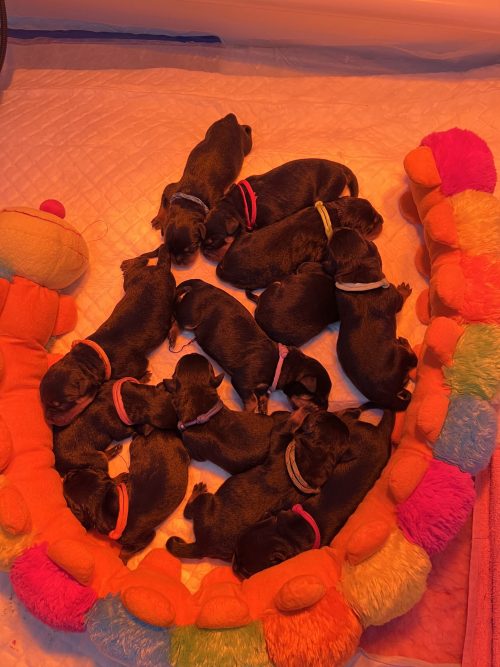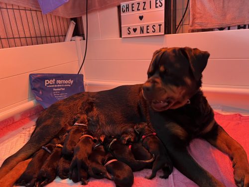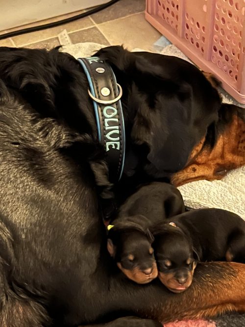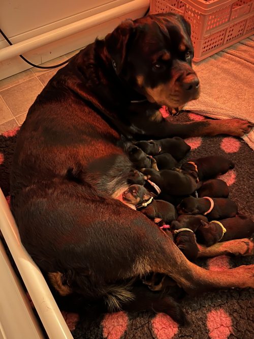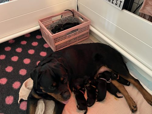 Olive is op 7 feb bevallen van maar liefst 12 puppen, en wat doet ze het goed. Ze moest even landen, als mama maar doet helemaal wat ze moet doen als mama. Maar 12 is wel veel, dus we maken vaak 2 ploegjes zodat ze allemaal kunnen drinken..