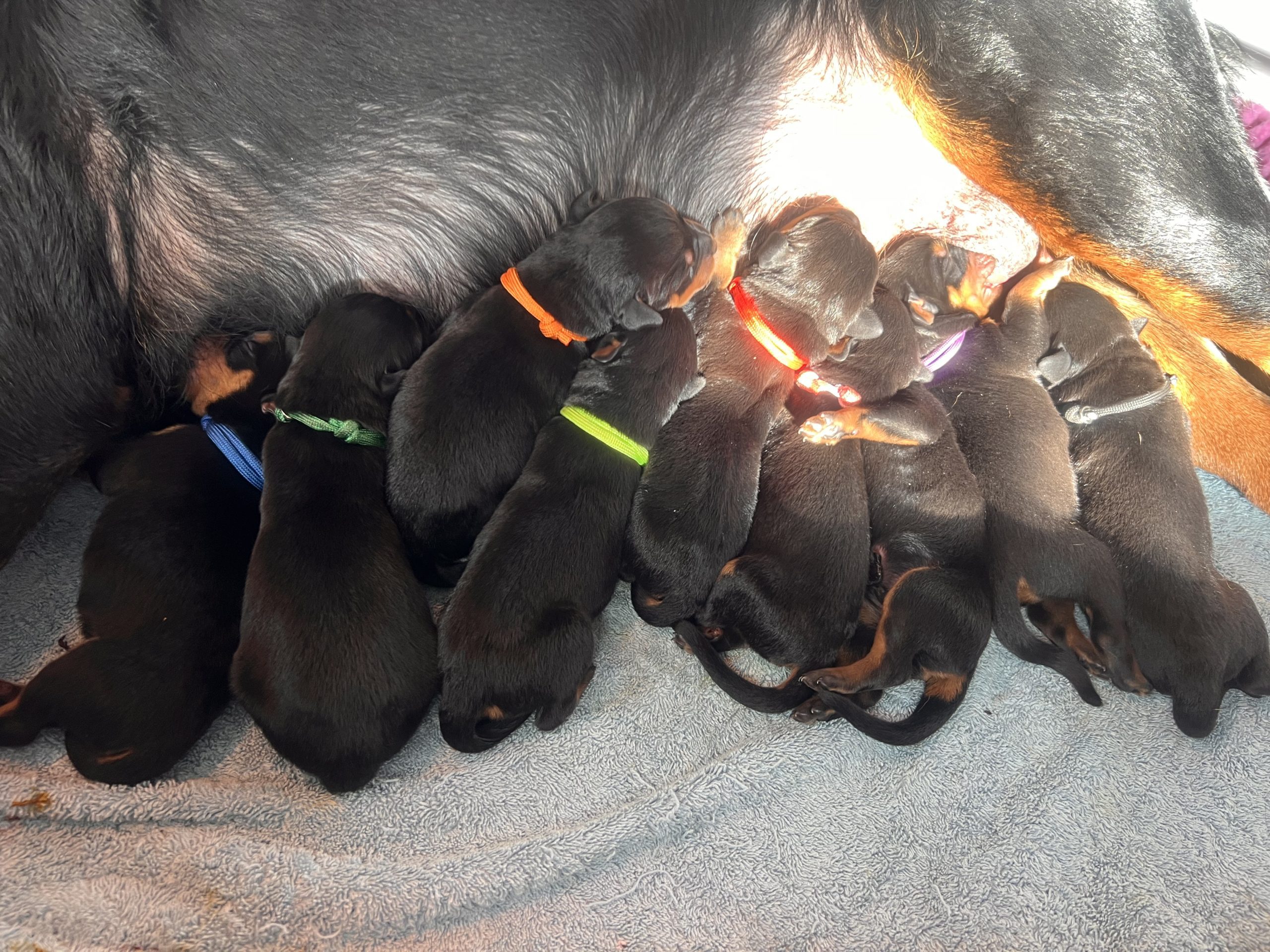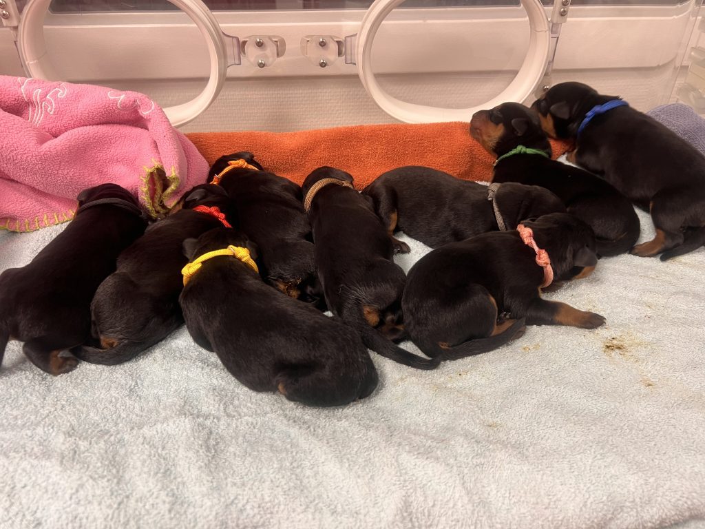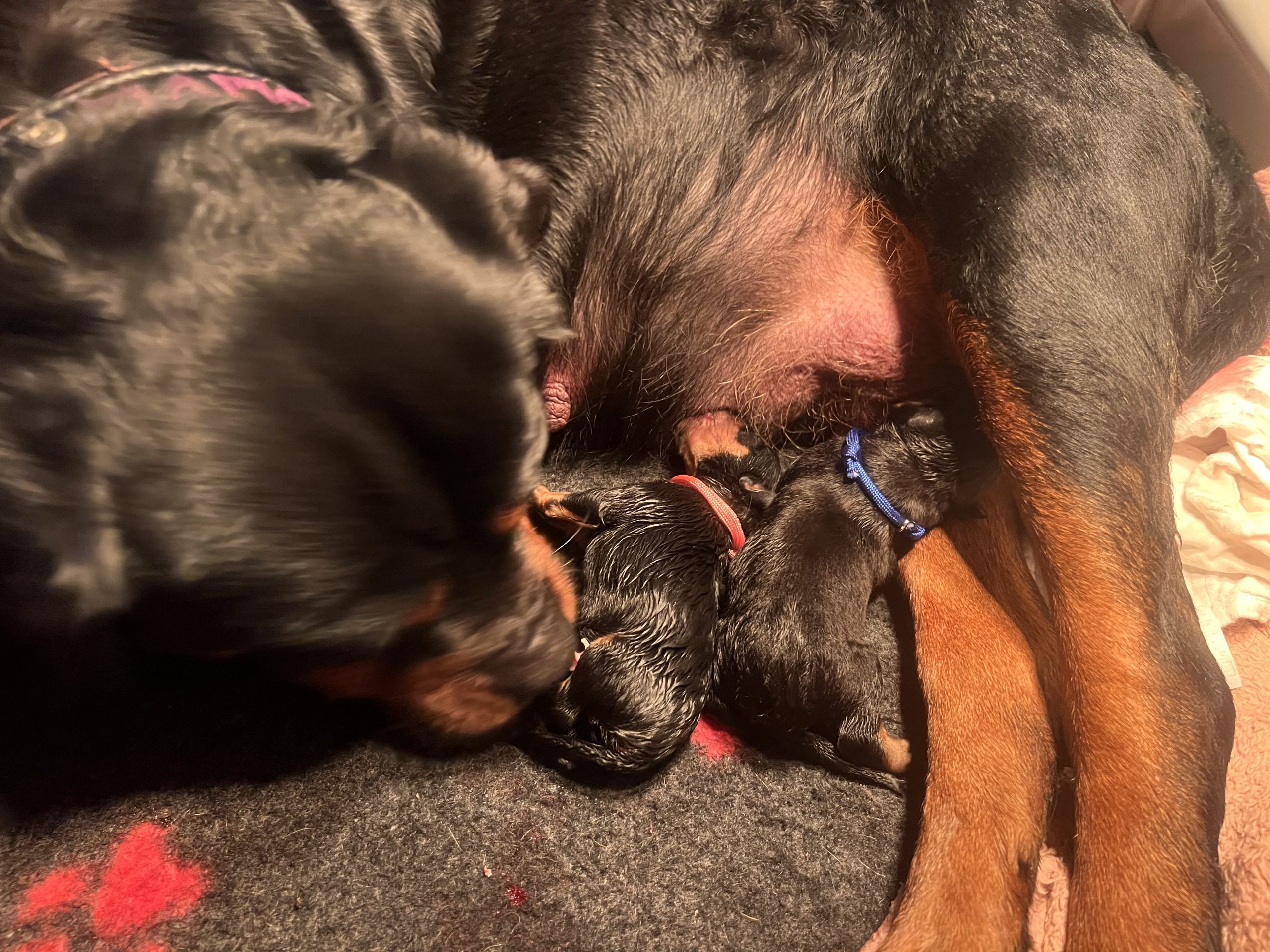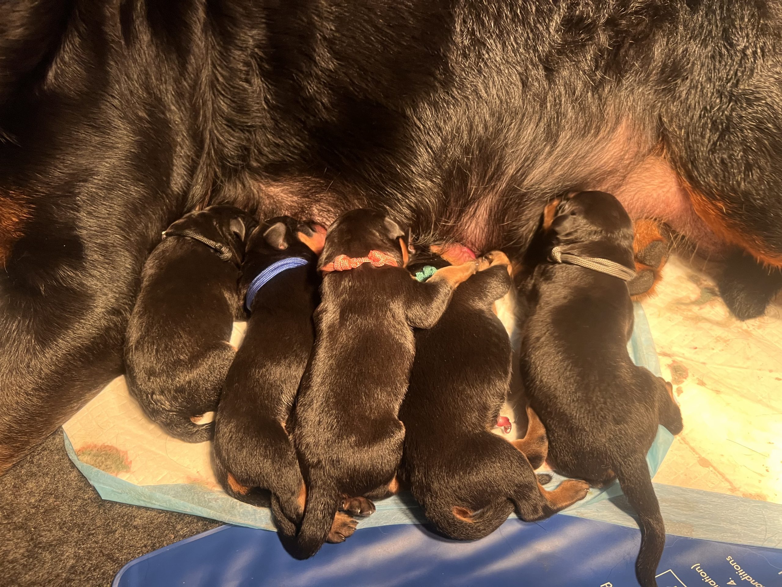 Met Olive ging het gelukkig goed. Eenmaal weer thuis ontfermde zij zich direct over haar prachtige nest Rottweilerpups. Wat is ze toch een geweldige moeder. We zijn ontzettend trots op haar en dankbaar dat alles zo goed is verlopen.
