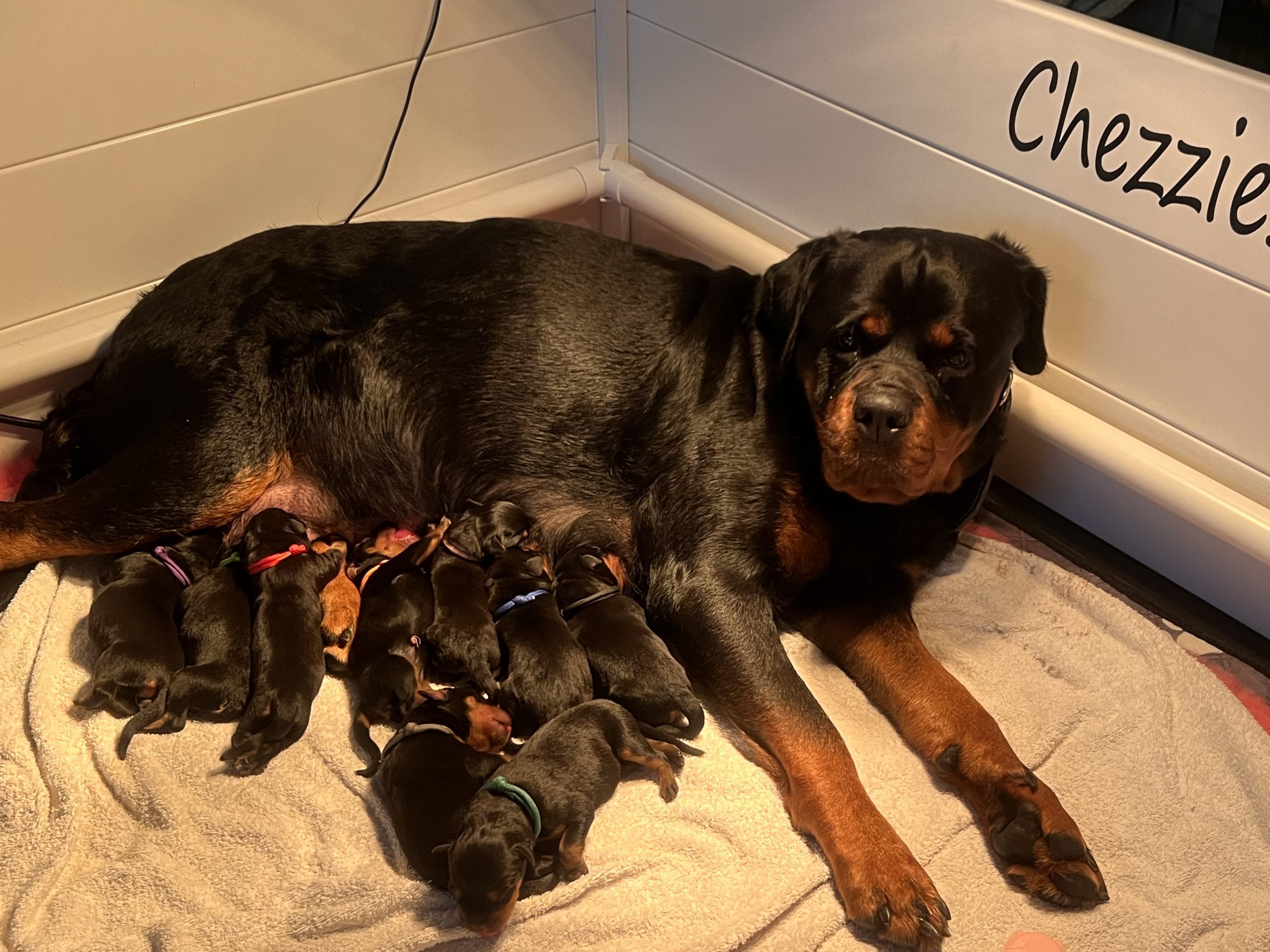 Op 20 februari zijn bij Chezzies Rottweilers maar liefst 9 Rottweilerpups geboren: 4 reuen en 5 teven.